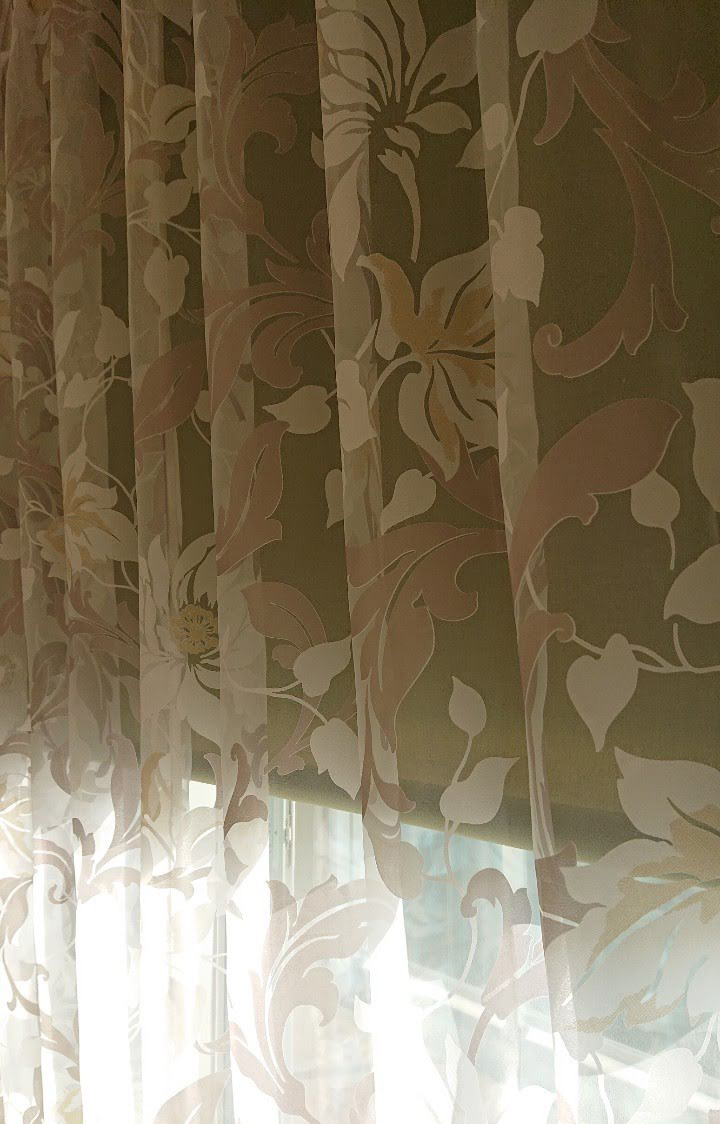 素敵な柄のレースを手前(フロントレース)にすると、気品のあるすっきりした窓辺になります。